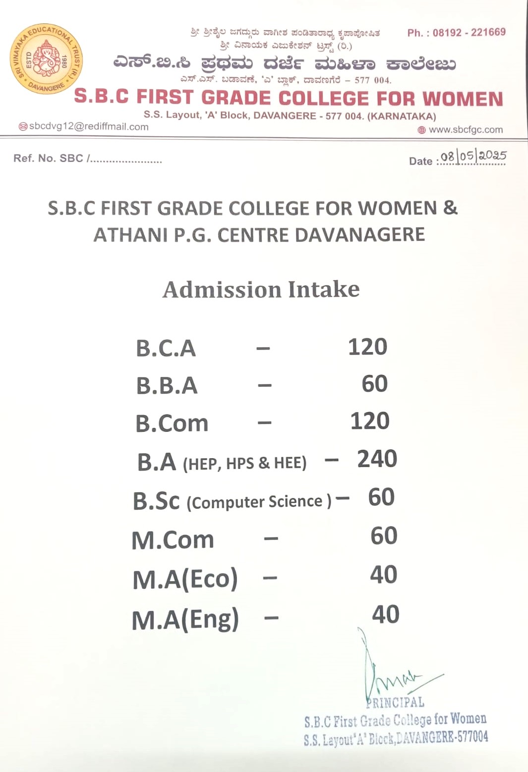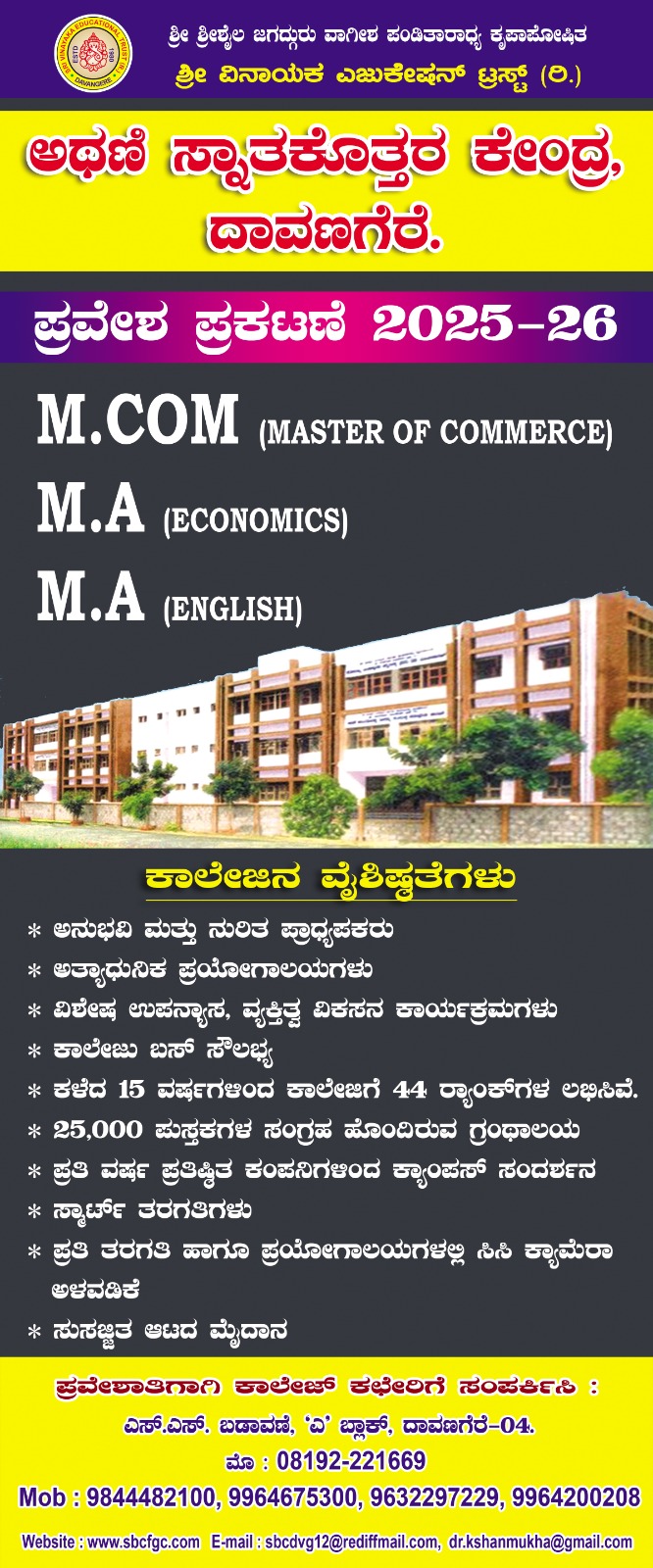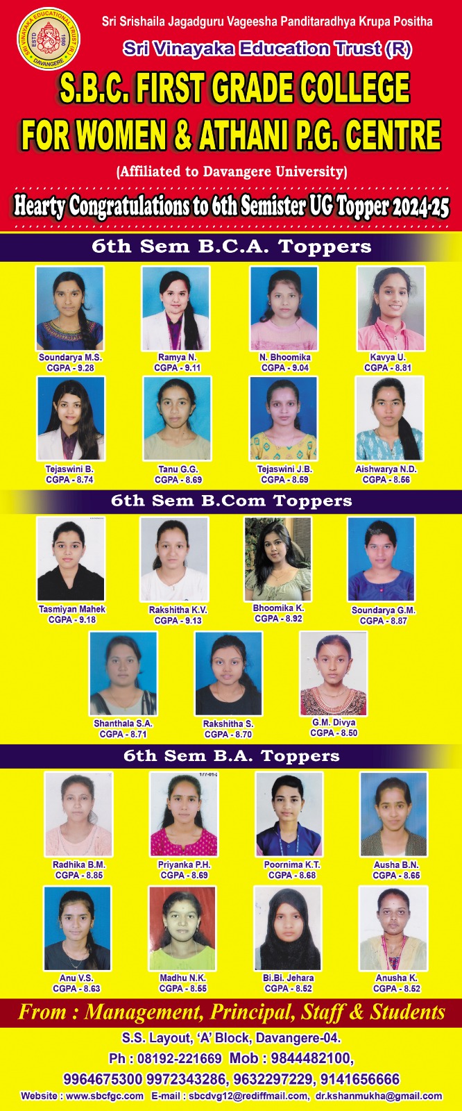 Sri. Vinayaka Education Trust is a charitable organization founded by a band of public- spirited and service oriented people of Davangere, whose aim is to provide education to the student community. It took its birth in the year 1980. Every year Sri Vinayaka Education Trust conducts various activities to desiminate culture and creates love and taste for arts among the citizens. Considering education as a part of culture, Sri Vinayaka Education Trust took another stride by starting G.M. Nursery school, P.E.S Primary School and Vinayaka Trust High-School. SBCFGC has a proactive Training, Development and Placement Cell.